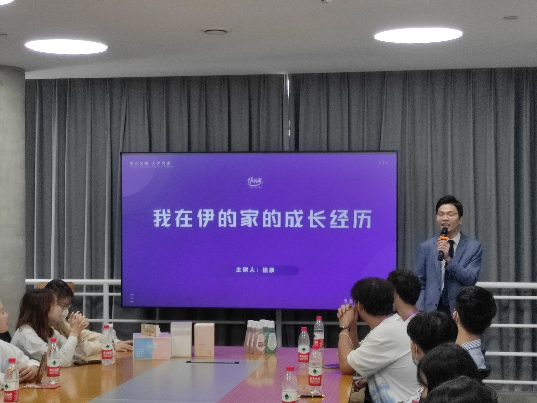 经过中午的休息后,由公司HR祖康分享了他在伊的家成长的经历,介绍了他在毕业时期的迷茫,选择伊的家的过程,在伊的家的成长等,在祖康幽默诙谐的分享氛围中,也给予同学们未来的择业和职业规划指导和启发。