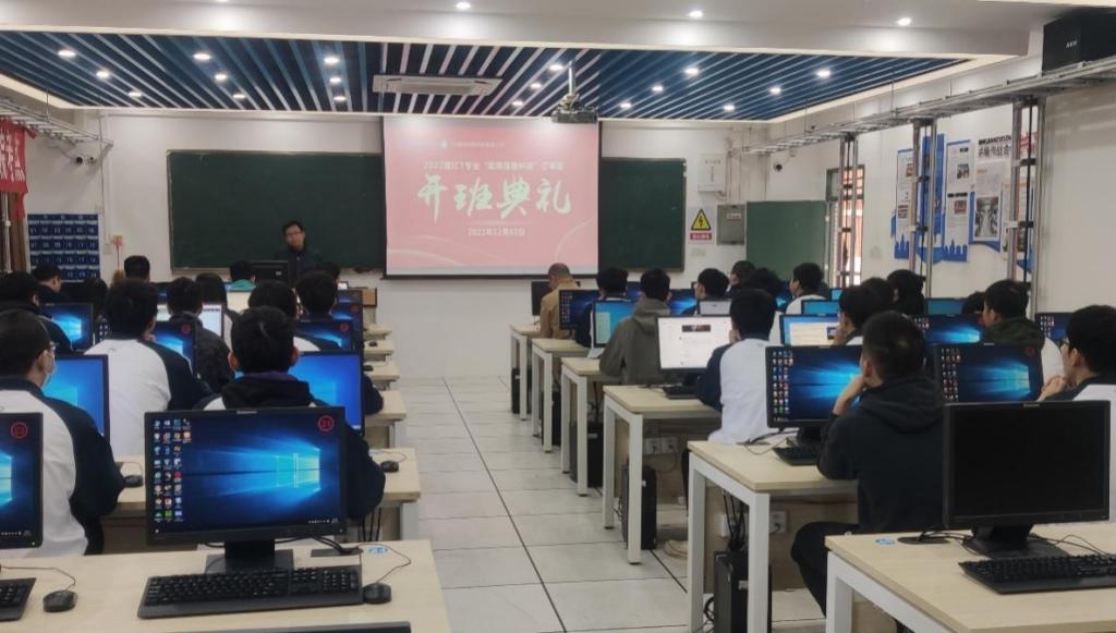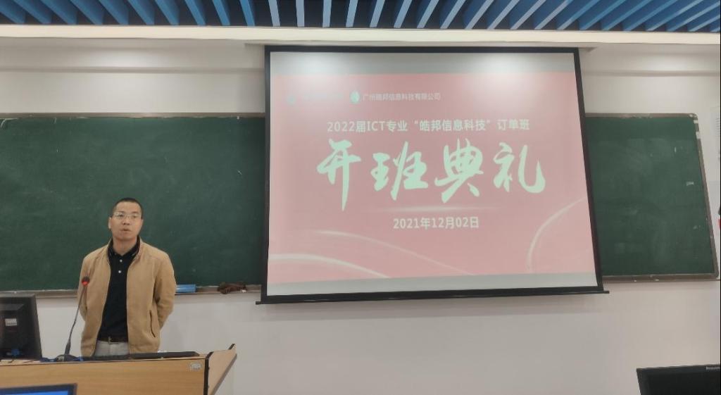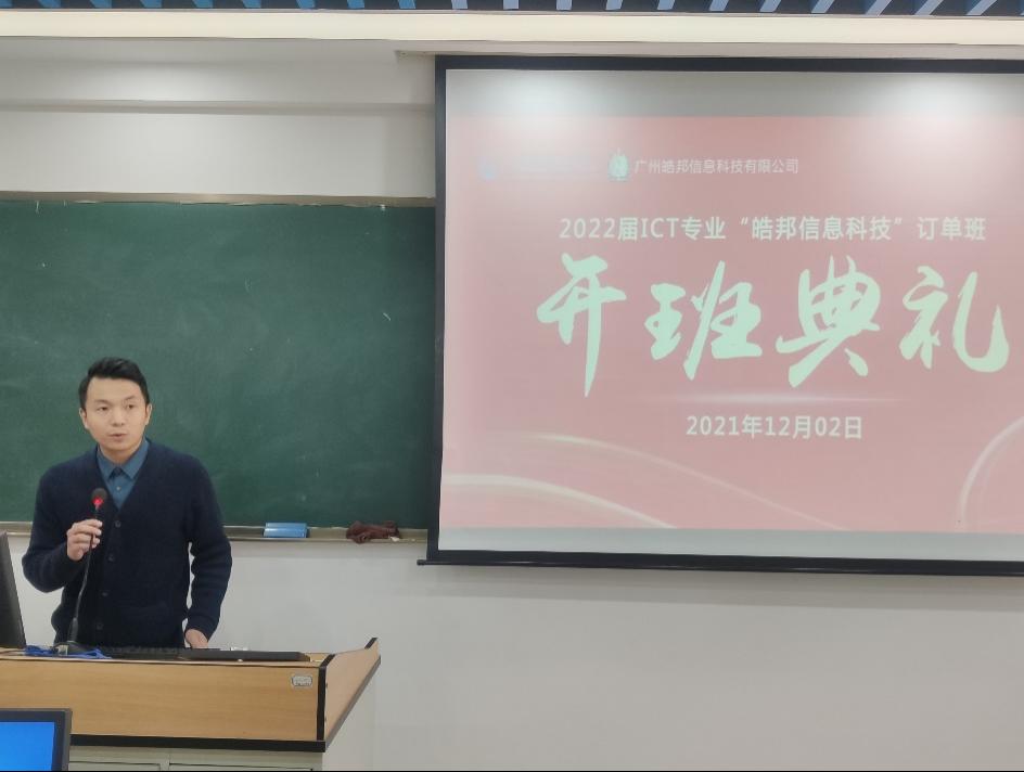 12月2日,第一期“皓邦信息科技”订单班在信工财经楼309网络综合实训室顺利开班。皓邦公司总经理纪家辉、技术总监余恒怡、培训讲师谢晓航、项目经理钟道恩,学院院长曹春华、副院长刘杰、教研室主任禤东桦及订单班学生参加开班典礼。开班典礼由副院长汤锋主持。