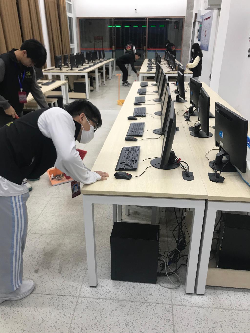 17点45分,同学们走进信工财经楼的公共机房中,手持扫帚、抹布等工具,将机房内的垃圾杂物等迅速分类清理,叠放键盘、收纳鼠标,拂去室内灰尘以及门窗上的污渍......同学们不怕脏、不怕累,分工明确,动作迅速,为在机房上课的师生创造干净、整洁、卫生的学习环境。