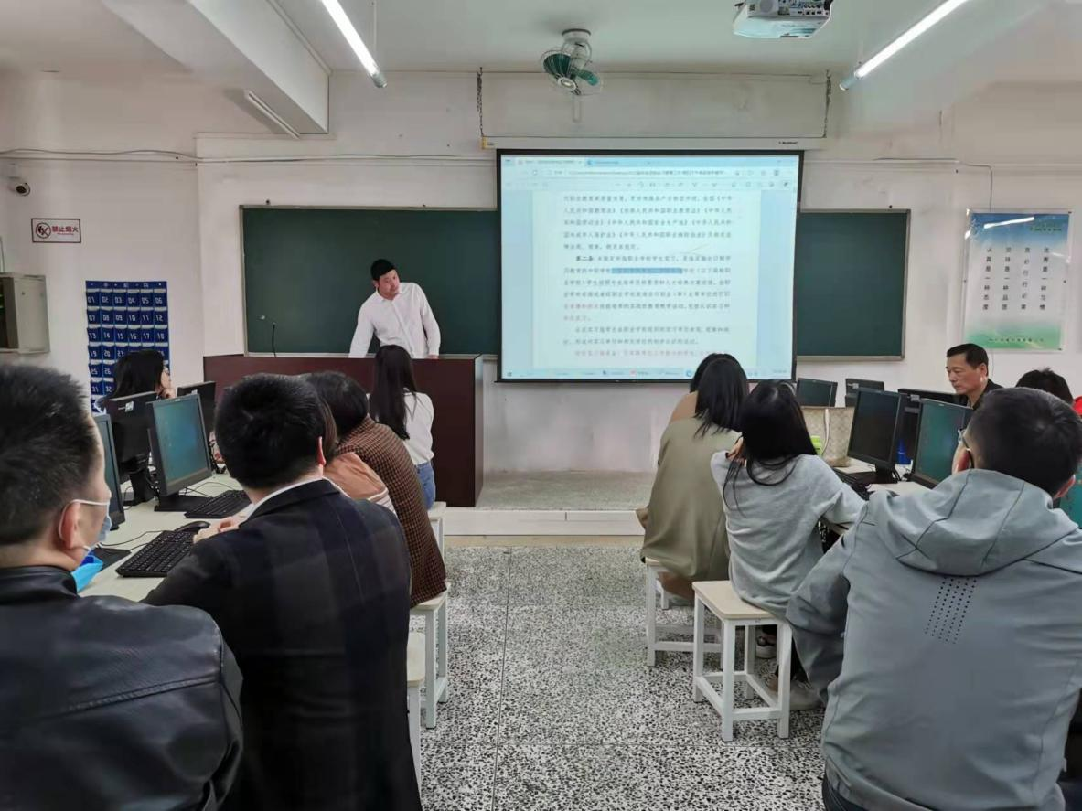 会上,谢金荣对教育部等八部门关于印发《职业学校学生实习管理规定》的通知内容进行详细解读,介绍落实实习管理协同机制,提醒老师们严守实习基本规范的底线红线,并对《职业学校学生实习管理规定》的新旧政策对照学习,就学生顶岗实习过程中的一些重要问题进行特别强调,不得跨专业大类安排实习、没签订实习协议不得实习等。