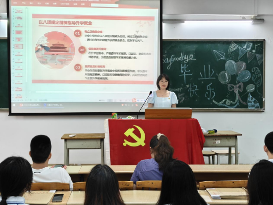 活动伊始,苏碧玲同志以“中央八项规定精神引领青春航向”为主题开展专题学习,通过“三个结合”深化教育内涵:将中央八项规定精神与廉洁从业要求相结合,引导毕业生党员筑牢拒腐防变思想防线;与学术诚信规范相结合,强调“论文写在祖国大地”的价值追求;与职业发展路径相结合,勉励党员在升学就业中争当“清朗职场”的践行者、示范者。