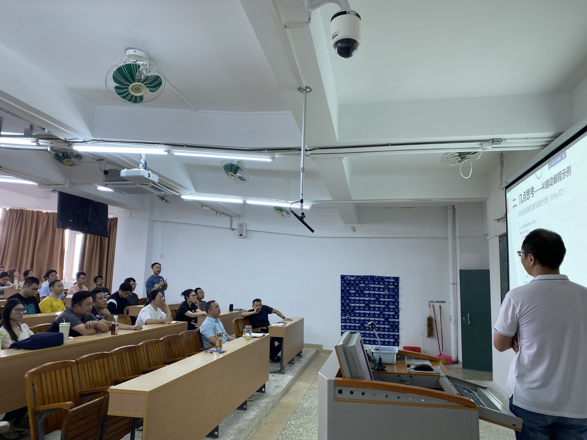 人工智能赋能教育成为会议焦点。曹春华详细演示AI 工具在教学中的应用场景, Python 教学中嵌入 AI 代码纠错助手等AI工具。现场互动活跃,如曹春华与王昆教师对话“关于AI豆包生成动画过渡与混合代码 (以《Unity3D交互设计》课程为例)”。