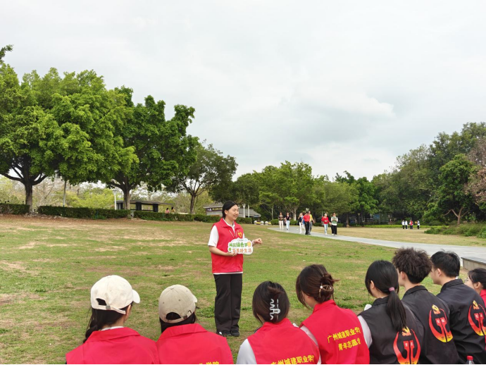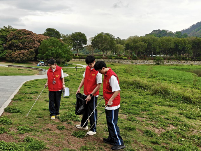午后的从化风云岭湿地公园,草木葱茏、水清岸绿,但草地间偶有散落的塑料垃圾、废弃杂物,影响了环境的整洁。出发前,带队老师苏碧玲明确了活动分工与安全注意事项,强调此次活动不仅是一次环保实践,更是雷锋精神的当代传承。随后,大家手持垃圾袋、垃圾夹,分组行动,投入到垃圾清理与环保宣传工作中。