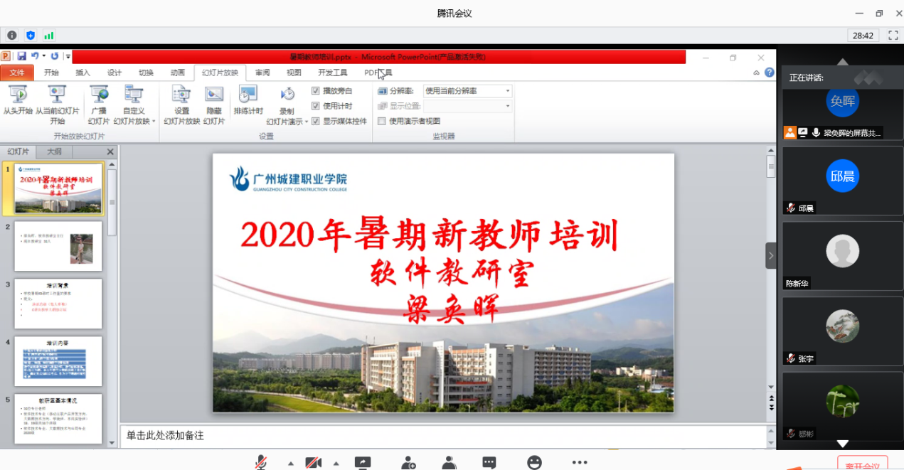 为了让新入职教师尽快熟悉教学环境,提升职业教学技能8月16-30日,按照学院工作安排,软件技术教研室对2019年以来入职新教师展开培训,培训采用腾讯会议线上模式进行,共有8位新老师参加。
