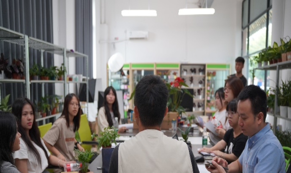 10月29日,学院苁花绿植电商直播创业先锋班和短视频剪辑与直播创新人才实战营两个先锋班部分学员代表在张华杰老师的带领下,来到苁花绿植培育室与企业导师程东成进行联合授课,在充满活力的教室中,学员们迎来了一场关于绿植直播与脚本撰写知识的课程。学员们表示这次课程不仅让他们对直播与脚本的撰写有了全面的认识,同时对绿植的直播有了更深入、更直观的感受,也为他们带来了许多宝贵的收获。