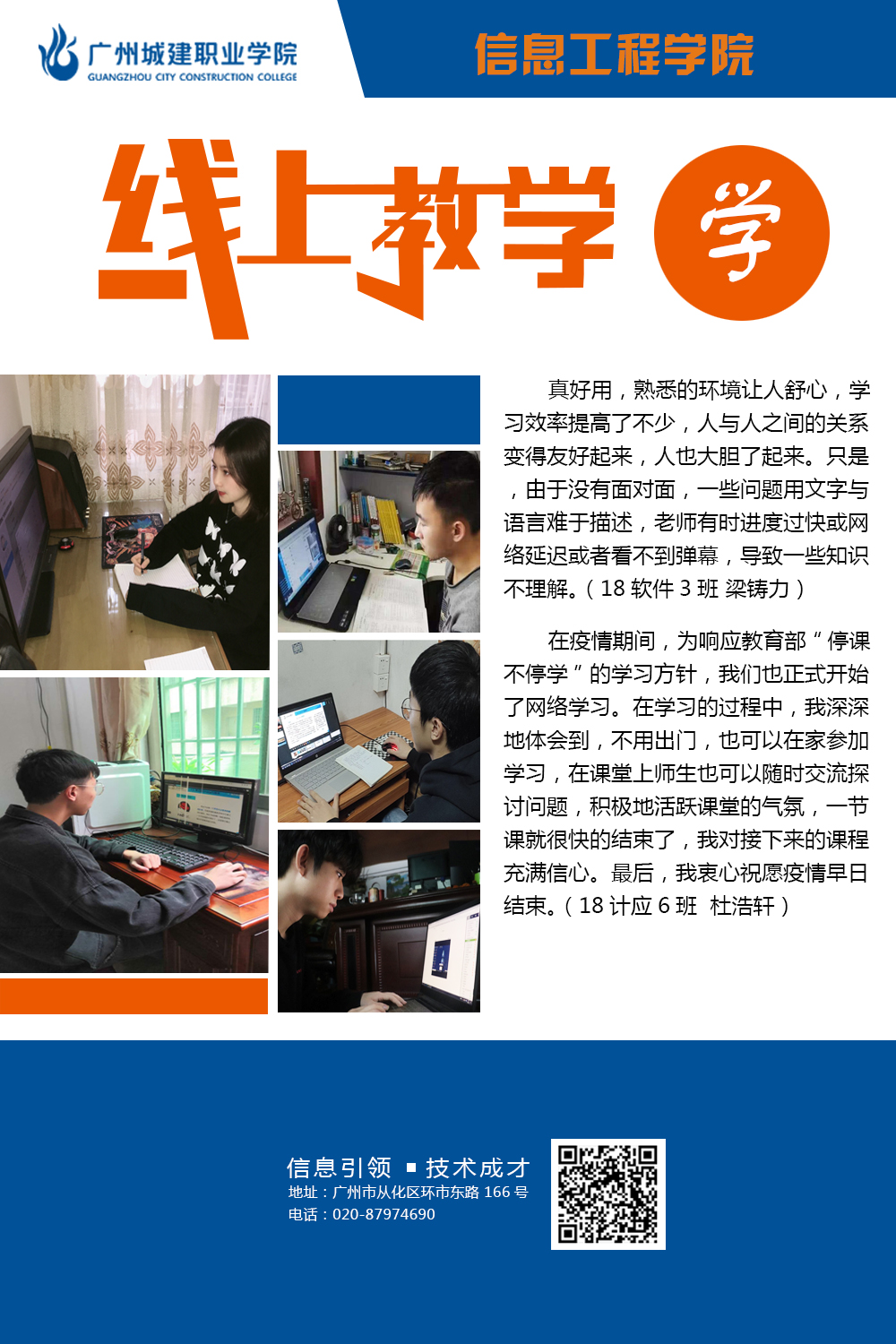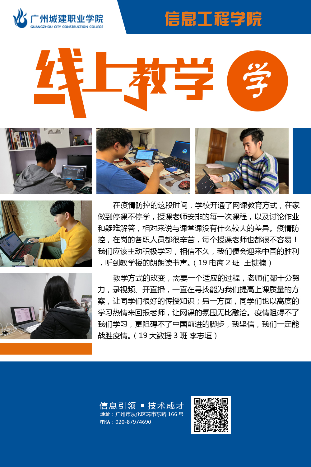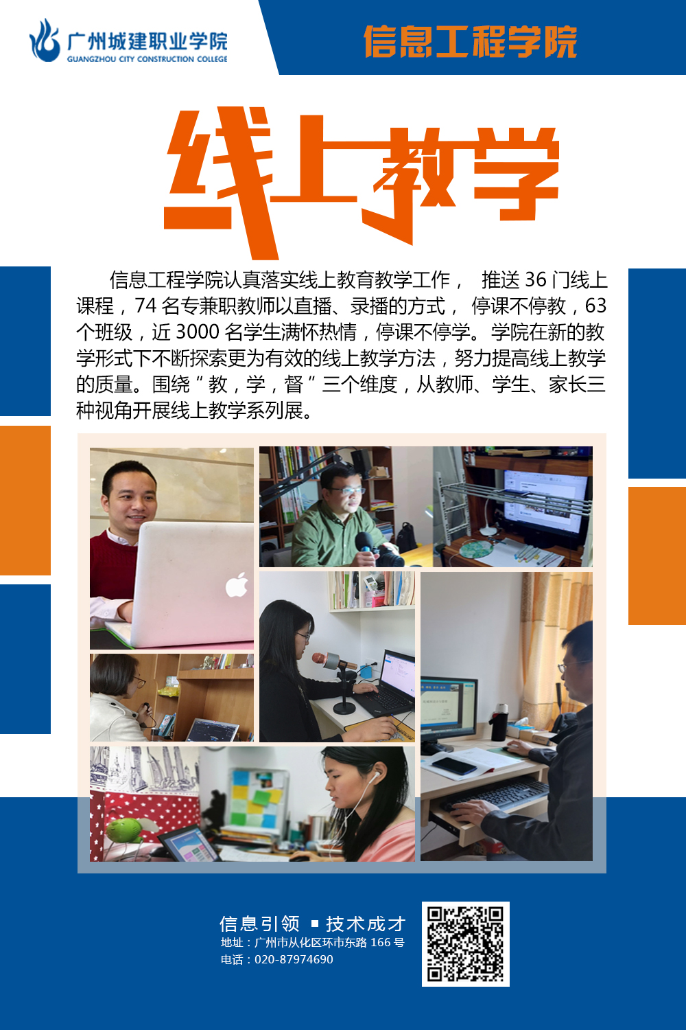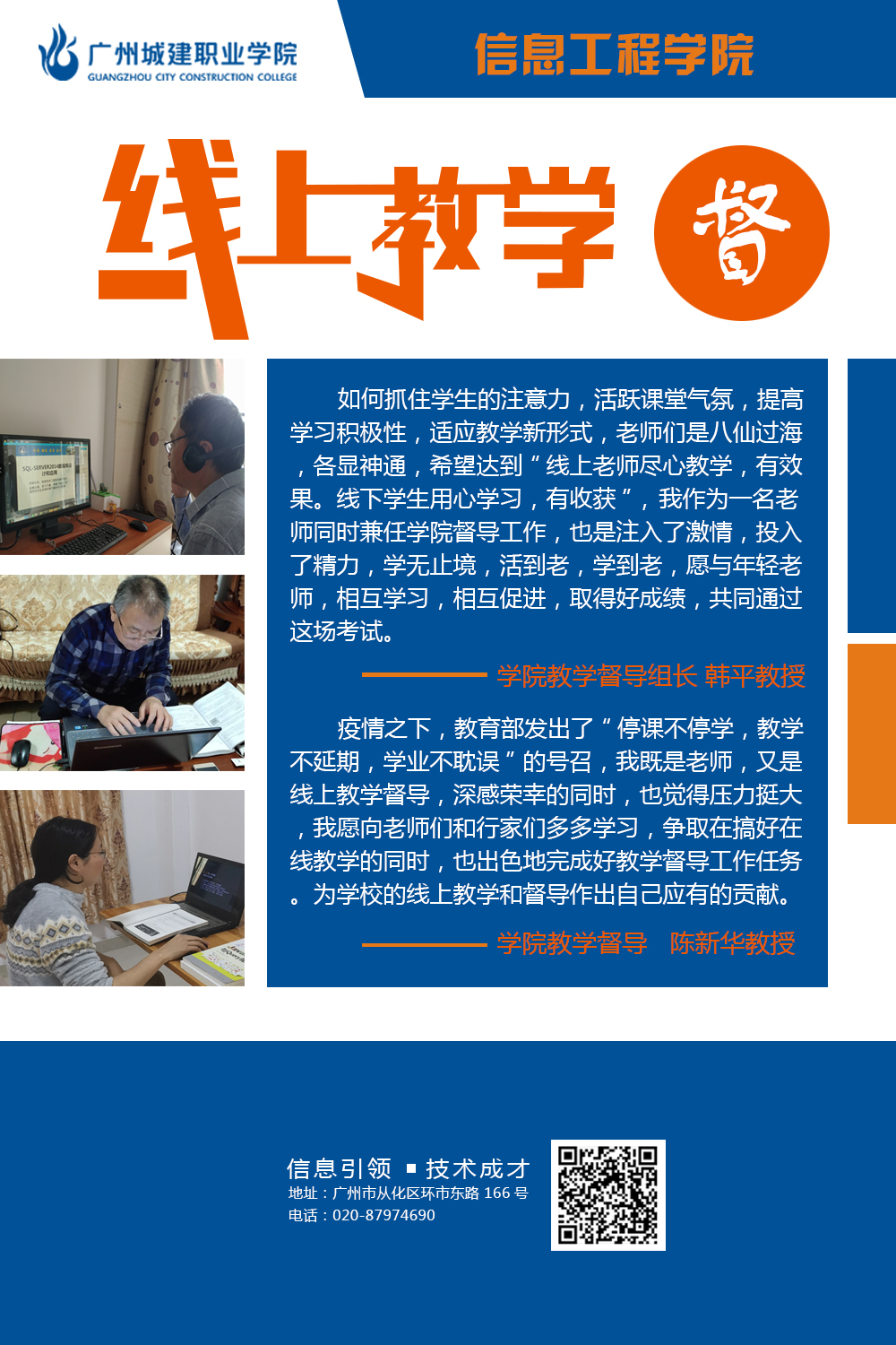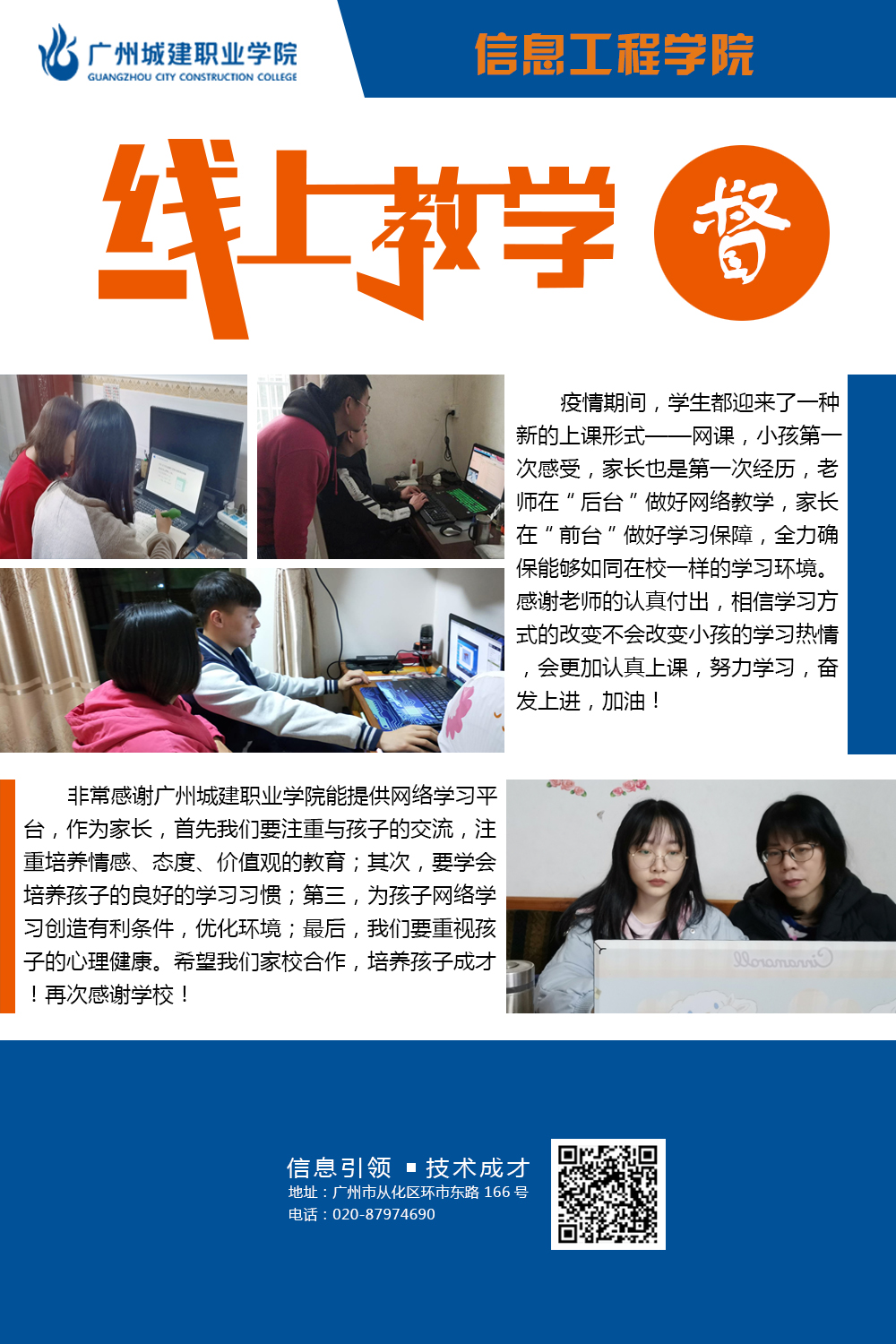 学院在新的教学形式下不断探索更为有效的线上教学方法,努力提高线上教学的质量,确保学生管理有条不紊,井然有序。不断激发工作新思维,按照学校线上教学工作要求,落实落地落细各项工作,充分挖掘教师信息技术应用过程中优秀典型案例,不断开拓创新管理水平,工作取得新成效。本次图片展,学院选取“教、学、督”三个维度,从“教师、学生、家长”三个视角,挖掘线上教学工作闪光点。