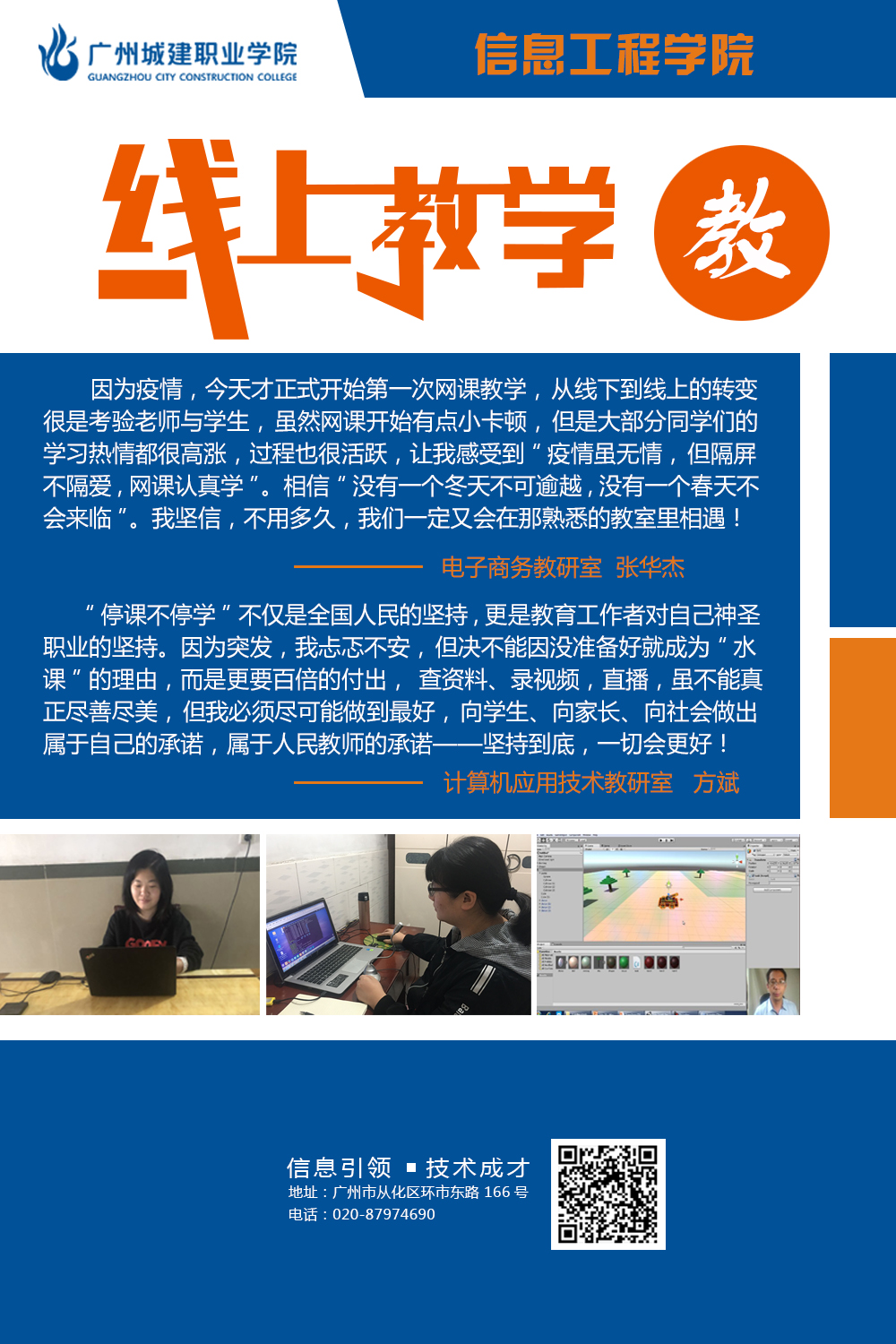 ok138太阳集团古天乐认真领会线上教育教学工作精神,结合学院实际情况,推送36门线上课程,74名专兼职教师以直播、录播的方式,停课不停教,63个班级,近3000名学生满怀热情,停课不停学。