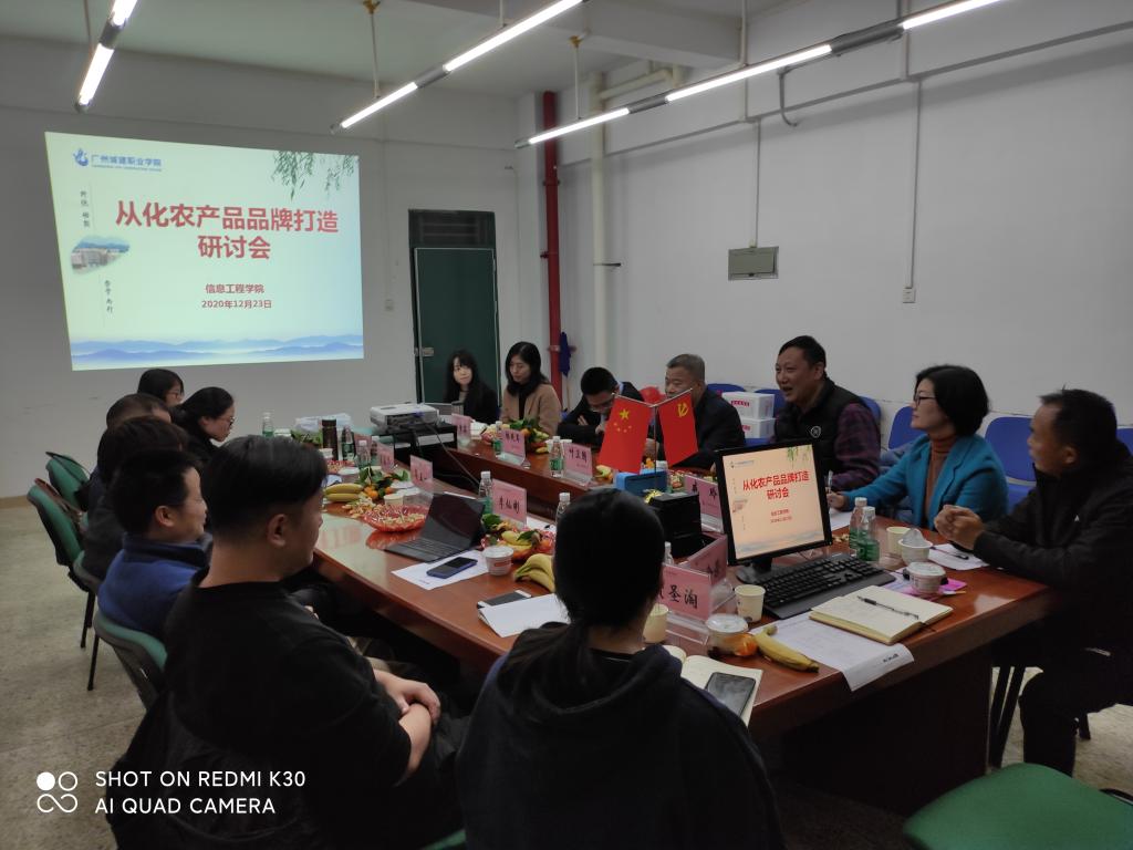 12月23日,从化农产品品牌打造研讨会在信工财经楼328会议室召开,从化区作协书记叶卫国、主席刘向阳、秘书长林延军,广州水食品有限公司厂长蔡家和、销售经理戚玲、学校科技处处长鲁五一、ok138太阳集团古天乐院长曹春华、副院长李灿彬等15位领导和老师出席本次研讨会。