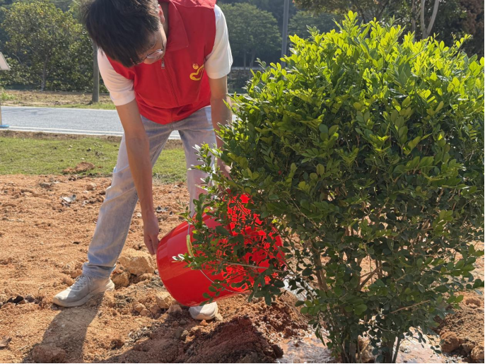 随后,大家领取工具,在专业人员指导下分工协作、默契配合,挥锹挖坑、扶正树苗、回填土壤、围堰浇水,每一道工序都细致认真,现场洋溢着青春的朝气与劳动的喜悦。经过一上午的辛勤劳作,师生们共种植苗木约15株,一株株新绿迎风挺立,为流溪河岸增添了一道生动的风景线。