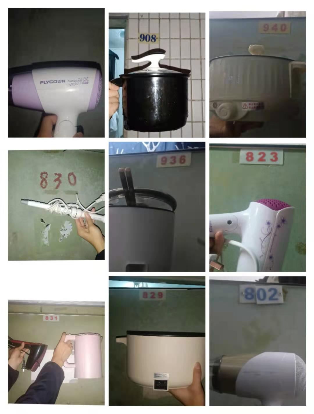 排查行动共查获50余件电饭锅、炒锅、吹风筒(超1000W)、电热水壶等违规电器。通过排查,加强了学生的安全防患意识,进一步规范了学生宿舍管理。