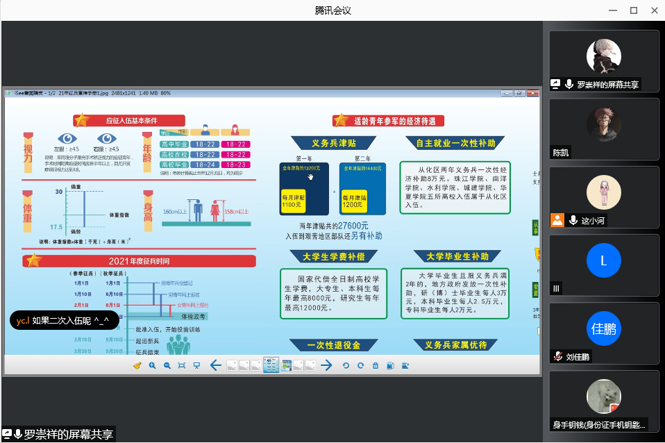 会上,罗崇祥首先对参会同学就大学生入伍相关政策进行了详细地说明讲解,讲解内容主要包括报名时间和条件、资料填写、体检流程、服役待遇、退役优惠政策和学校鼓励大学生入伍的激励政策等。同学们反响热烈,线上积极提问,咨询入伍相关问题。