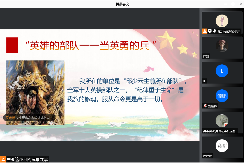接着,两名2017级退役复学的同学也连麦到会议室,跟同学们分享了各自的入伍经历和军旅生活,他们表示身为新时代的大学生,理应响应国家号召,参军入伍献身国防,部队教会了他们很多在外面学不到的知识,很庆幸“自己”青春里有迷彩的样子。