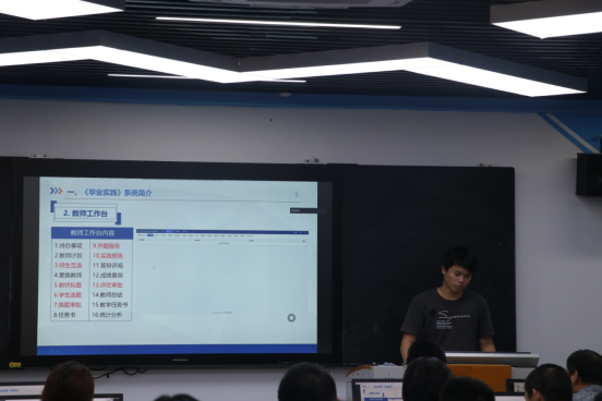 会上,彭远平针对《综合实践项目》及《岗位实习》系统相关模块功能作了详细的介绍和操作使用培训。