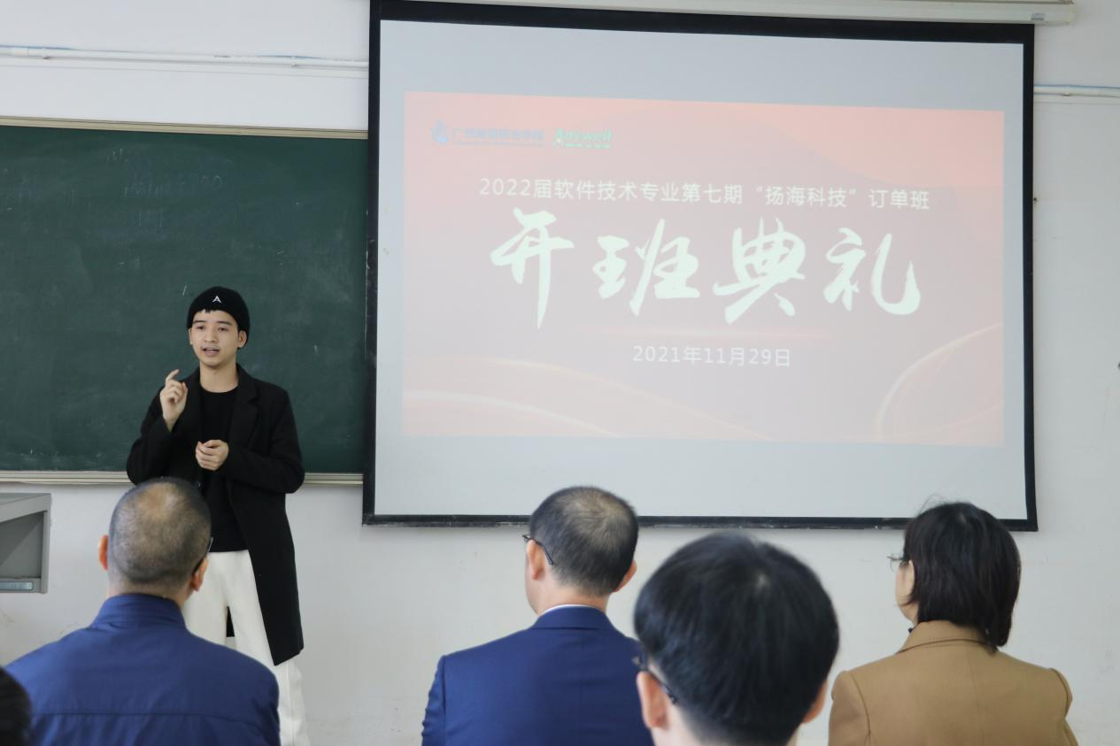 第七期“扬海科技“订单班班长舒子懿代表全班同学表态,一定会珍惜学校和公司提供的这个订单班学习平台,扎实充电,努力学习知识。