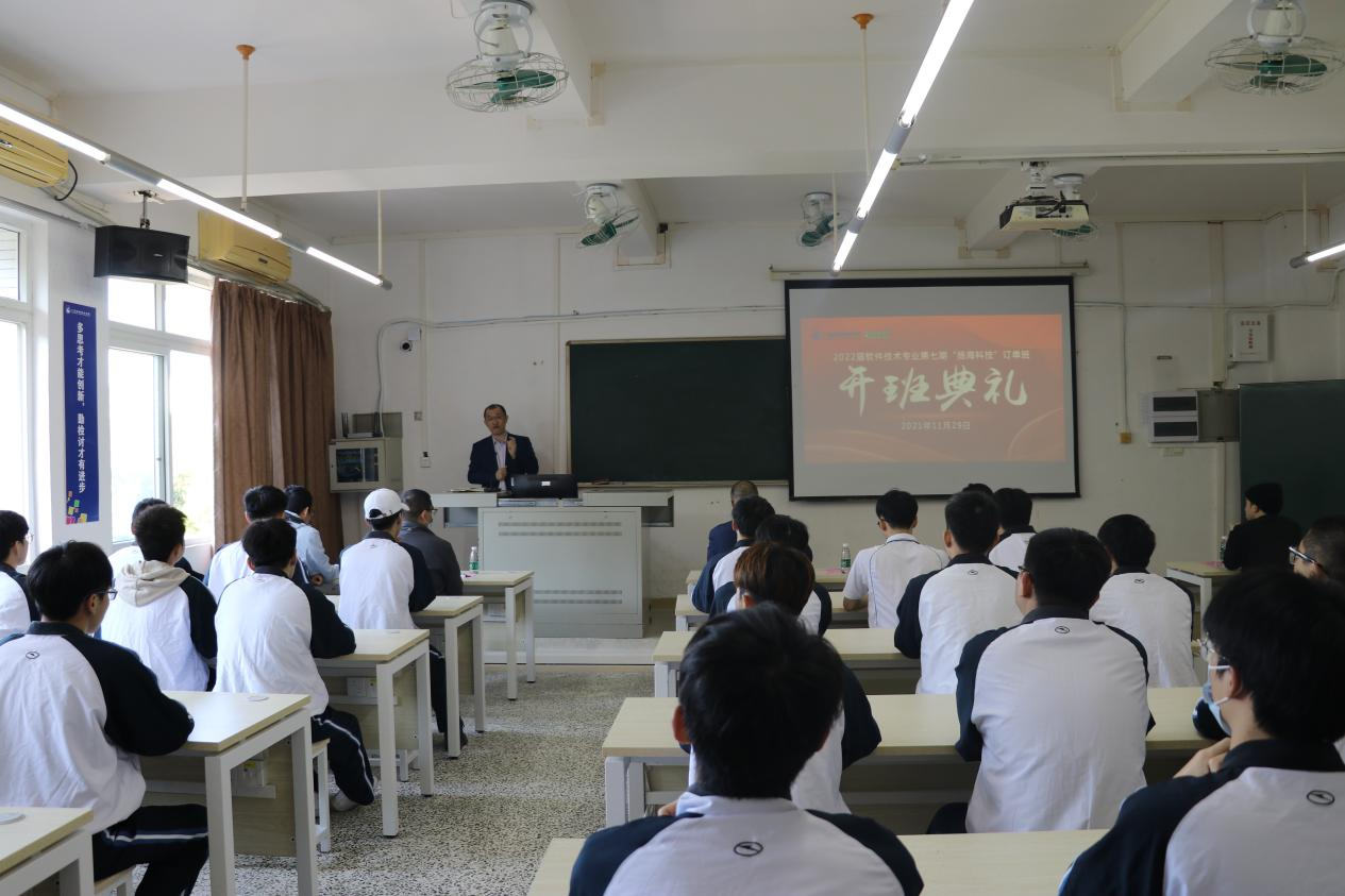 11月29日,第七期“扬海科技”订单班在信工财经楼321课室顺利开班。广州市扬海数码科技有限公司董事长凌远龙、董事长助理吴曼妮、经理梁国聪,学院院长曹春华、副院长刘杰、软件技术教研室主任梁奂晖及订单班全体学员参加了开班仪式。开班仪式由汤锋副院长主持。