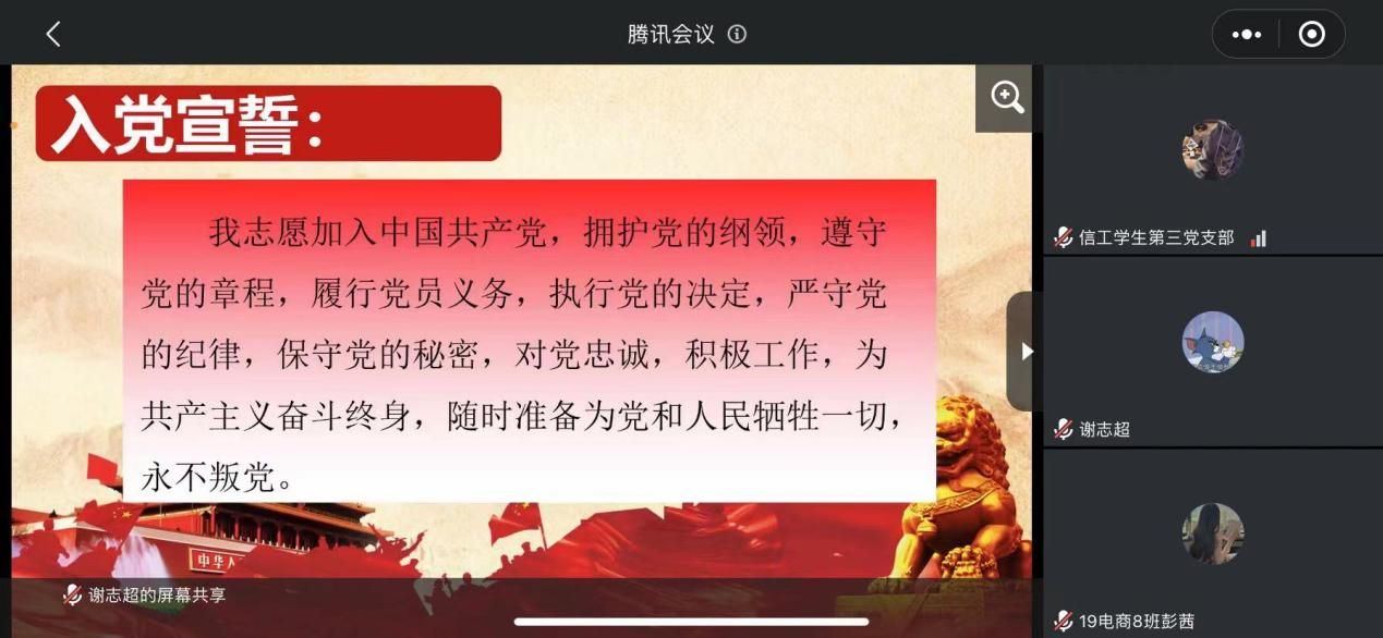 通过与会正式党员无记名投票,一致通过梁秋婷等20名预备党员按期转为中共正式党员,党龄从支部大会通过之日算起,谢志超宣读决议并带领同志们进行入党宣誓。