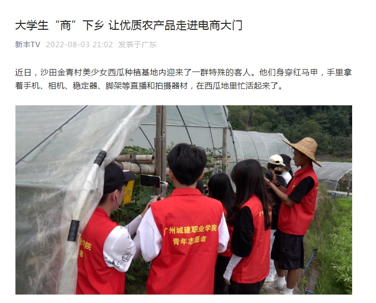 农村科技特派员团队各小组按照计划到达各乡村,金青村小组由学院党委书记刘杰带队,长引村小组由李咏洁老师带队,天中村小组由学院副院长李灿彬带队。各小组根据每个乡村不同的情况,进行拍摄、短视频制作、撰写推文、直播、网店开设和运营、电商培训、义务支教等活动。由于天气炎热,各小组成员每天早上5点多起床,乘着早上的凉风外出拍摄采风,中午和下午集中在会议室进行图片处理、短视频制作和推文撰写等等,晚上进行总结和布置第二天的工作任务,通过抖音号、视频号、公众号等平台进行宣传推广。同时新丰TV、广东电视台、中国青年网等媒体对本次电商助农活动进行了报道。