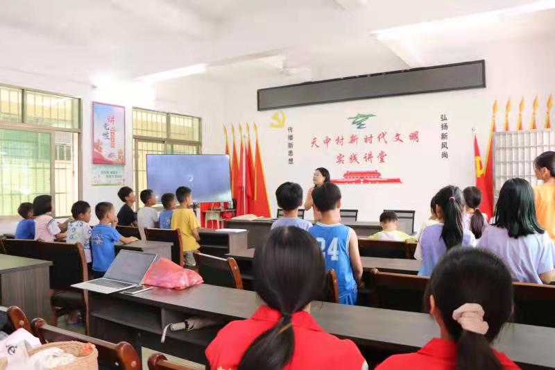 天中村总地势南高北低,是汇入北江的沙田河的源头,山清水秀,绿意葱葱,沿途有从石缝流出的可直接饮用的山泉水,是休闲旅游和徒步运动的好去处,这里有千年红锥古树,大片红锥树林,保存比较完整的百年客家围屋,也是东江纵队北江支队集训队,建有天堂村爱国主义教育基地,特色农产品有千苗百香果基地,砂糖桔、蔬菜等。天中村农村科技特派员小组根据天中村非常丰富的旅游资源,为各个景点、爱国主义教育基地和农产品基地制作了一系列短视频和宣传推广,制作了天中村宣传短视频和旅游攻略,同时制作了时长为2小时的天中村访谈纪录片,详细介绍了天中村的特色,让人们更好的了解天中村的自然环境和革命故事。小组成员也走到百香果基地和蔬菜基地,帮助农户采摘并且进行直播宣传,同时指导村民进行拍摄、短视频制作、店铺开设、运营、直播等技能,利用空闲时间,组织村里的小学生,开展支教活动,指导学生们英语学习、唱歌、舞蹈、绘画等。