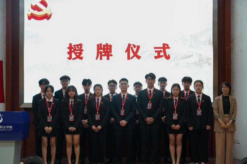随后,新一届干部、干事分别上台接受胸牌授予仪式,佩戴胸牌,便肩负着学院党建工作的重任,全体党建办公室成员将乘风破浪,续写新篇章。