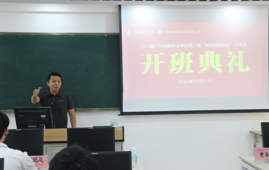 曹春华院长在讲话中提了三点要求,一是在当前疫情形势复杂、就业环境严峻、众多IT大厂裁员的条件下,皓邦信息科技自成立以来一直高速发展,业务不断扩展,企业经受大环境的考验,逆流而上,与学校共同开办第二期订单班,是出于对学校的信任,也是对学校的认可,希望订单班学生要珍惜此次机会;二是面对严酷的社会竞争,同学们要端正自己的态度,虚心、认真学习,在岗位技术技能上要学懂弄通,更好的服务客户、服务企业;三是因长时间的封校学习生活,面对枯燥乏味的学习生活,在刻苦学习的过程中,同学们要适当组织篮球、羽毛球等团体活动愉悦身心,给枯燥的学习生活增添运动色彩。