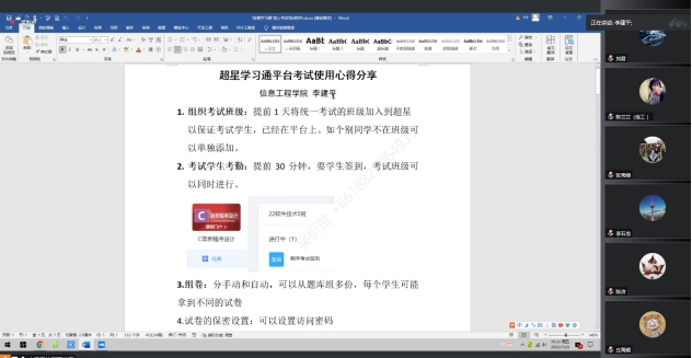 在分享交流会上,李建平老师总结了自己的使用经验,着重介绍“超星学习通”对于期末线上课程考核的使用方法,共有组卷、保密设置、考试签到、试卷发布、防作弊方法、教师监考、学生答卷、收卷、改卷、成绩导出等10个环节。并就手机端和电脑端的相关模块进行了详细的演示操作,分别站在了老师以及学生的角度考虑问题并进行经验分享。