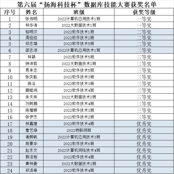 第六届“扬海科技杯”数据库技能大赛已圆满落幕,根据《关于举办第六届扬海科技杯”数据库技能大赛的通知》,经学生自主报名、教研室组织比赛,按照比赛成绩,现将获奖情况予以公示,公示期自2024年6月14日起至6月18日止。