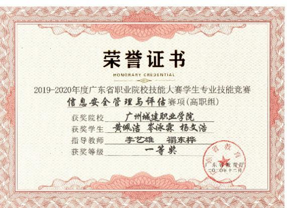 学院师生连续五年荣获广东省职业院校学生专业技能大赛“网络系统管理”赛项一等奖,近五年4次荣获广东省职业院校学生专业技能大赛“信息安全管理与评估”赛项一等奖,获得第十五届全国大学生信息安全竞赛创新实践能力赛华南赛区三等奖、第六届“强网杯”全国网络安全挑战赛-强网先锋、第十六届全国大学生信息安全竞赛创新实践能力赛、2023 一带一路暨金砖国家技能发展与技术创新大赛一一企业信息系统安全赛项选拔赛、华为ICT大赛2023-2024广东省 实践赛-网络赛道高职组中荣获二等奖、华为ICT大赛2023-2024”广东省实践赛-网络赛道高职组中荣获优秀指导教师奖、第十五届大学生科技学术季活动之第二届广东大学生网络安全攻防大赛二等奖等一大批荣誉。