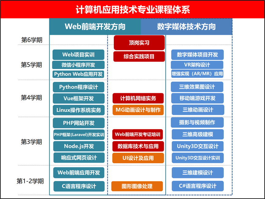 本专业围绕网站开发、VR开发、UI设计、多媒体产品设计等主要岗位,分别开设了Web前端应用开发、Web前端框架开发、PHP网站开发、三维建模设计、三维动画设计、Unity3D交互设计、UI设计及应用、MG动画设计与制作等核心专业课程,专业课程体系图如下:
