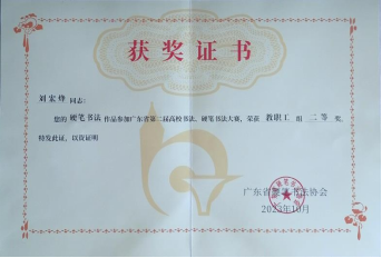 在业余时间,刘老师坚持练习书法,在书法艺术方面同样展现出了非凡的才华和热爱。虽然是一名业余的书法爱好者,与专业书法学习者,书法水平有着巨大的差距,但是刘老师并不服输,遇到困难仍然坚持训练。他十余次获得书法比赛的奖项,其中就包括广东省第二届高校书法比赛二等奖,“中国梦.硬笔情”第三届全国硬笔书法比赛获得佳作奖等。他的书法作品笔力遒劲、气韵生动,展现出了中国传统文化的深厚底蕴和艺术魅力。作为广东省硬笔书法协会的会员、广州市硬笔书法家协会会员,他积极参与书法交流和推广活动,用自己的艺术才华感染和影响着身边的人。