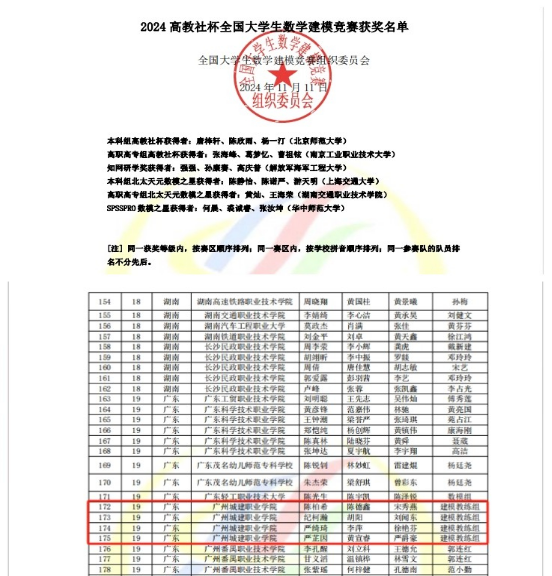 11月11日,2024年高教社杯全国大学生数学建模竞赛成绩正式揭晓,我校学子斩获全国二等奖4项,广东赛区一等奖4项、二等奖7项、优胜奖2项,获奖数量创我校历史新高!