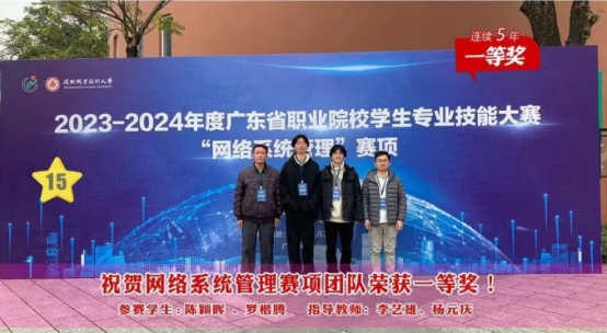 2024年1月24日至25日,由广东省教育厅主办的2023-2024年度广东省职业院校学生专业技能大赛“网络系统管理”赛项在深圳职业技术大学顺利举行。本次大赛吸引了来自全省67所院校、134名选手参赛。经过激烈角逐,由陈颖晖、罗楷腾两位同学组成,李艺雄、杨元庆两位老师指导的参赛团队以第2名的成绩荣获一等奖,这也是我院连续第5年斩获该赛项一等奖。