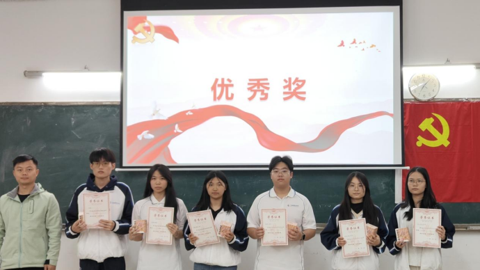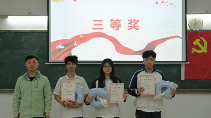 在热烈掌声中,苏碧玲、李思丽、王宇翔依次为荣获一、二、三等奖及优秀奖的同学颁发荣誉证书和奖品。