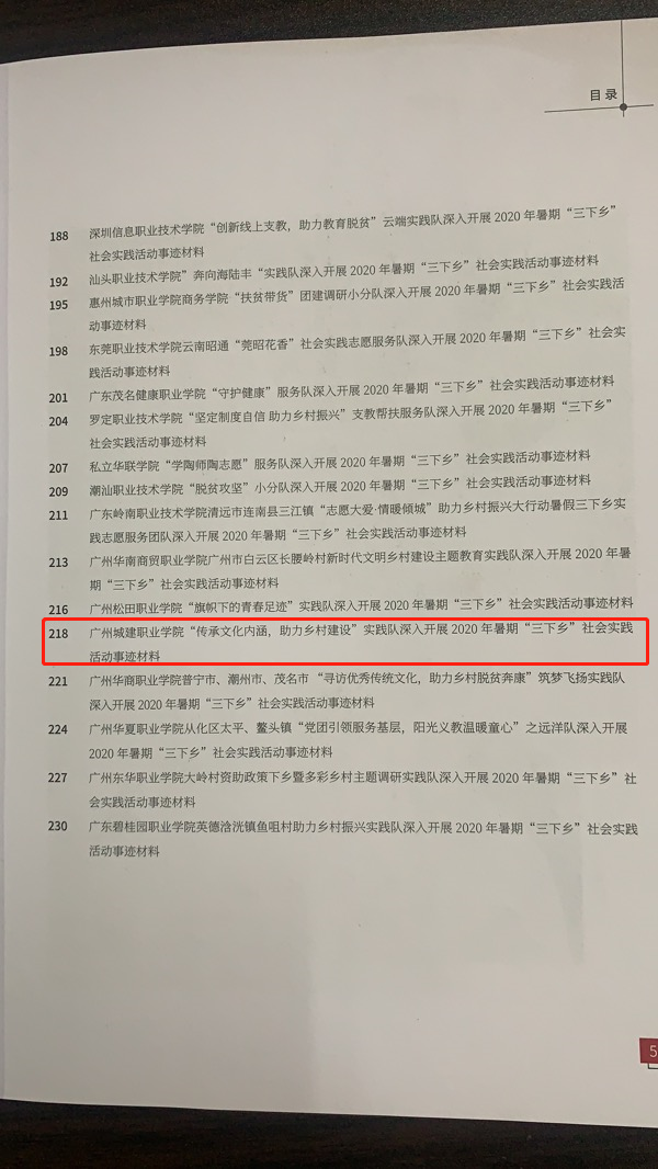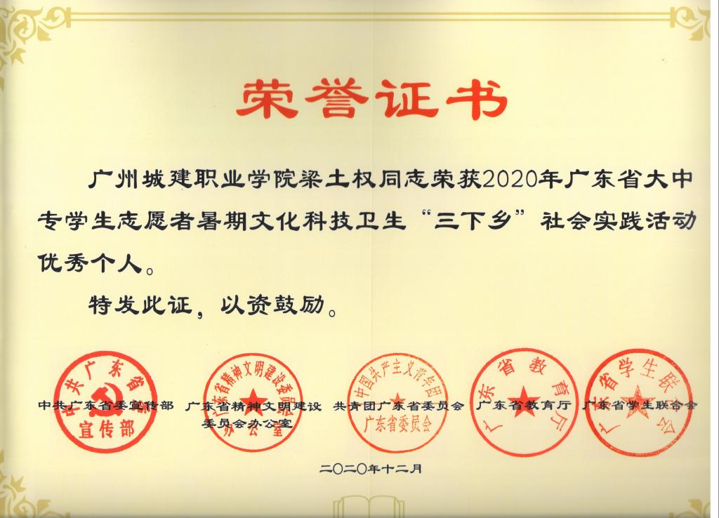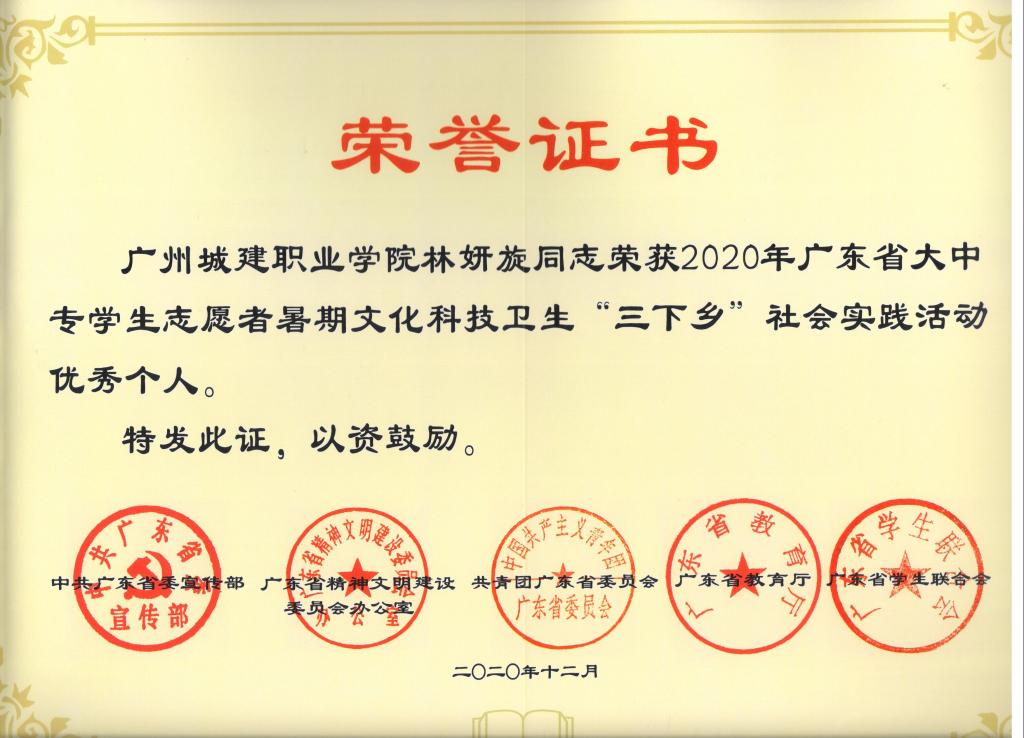近日,学院收到团省委下发的“2020年广东省大中专学生志愿者暑期”三下乡“社会实践荣誉证书。我院“传承文化内涵,助力乡村建设”实践队荣获优秀团队(为我校唯一获奖团队),梁土权老师和林妍旋同学荣获优秀个人(为我校唯一获奖的老师和学生),同时,实践团队的事迹入选了“2020年广东大中专学生志愿者暑期文化科技卫生“三下乡”优秀事迹材料汇编。