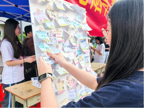 “撰写禁烟标语”互动环节中,同学们纷纷拿起笔,在便签纸上写下自己对于建设无烟校园的美好愿景与坚定决心,并将这些充满正能量的文字粘贴至展示板上,形成了一道别具一格的“禁烟文化墙”。一句句发自肺腑的话语,不仅是参与者内心信念的表达,更成为感染和带动更多师生加入到禁烟行动中的重要力量,墙上贴满了同学们手写的感悟与承诺:“无烟校园,从我做起”“拒绝第一支烟,拥抱健康未来”“清新空气,共享美好校园”……这些真挚而富有感染力的句子,不仅展现了当代青年积极向上的精神风貌,也为校园增添了一份文明与温暖的力量。