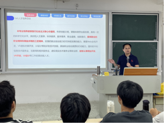 讲座开场,主讲教师首先阐明了计算机应用技术专业的培养定位。此专业与本地产业链及岗位需求紧密适配,主要面向互联网及相关服务业、软件和信息技术服务业,以及新兴的虚拟现实技术服务业,致力于培育在德智体美劳方面全面发展,掌握Web全栈开发、VR虚拟仿真开发、UI设计等核心知识与技能,具备良好职业素养、创新精神和可持续发展能力的高素质技术技能型人才。