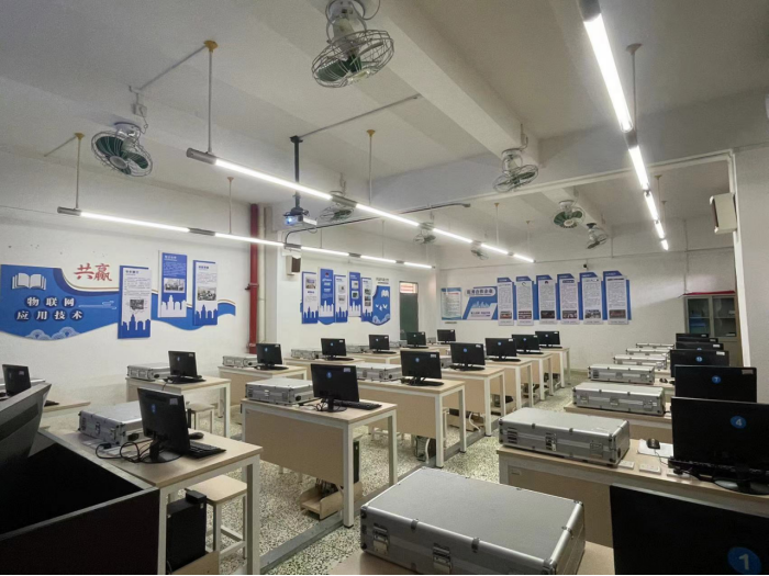 物联网应用技术实训室秉持“学以致用”的教学理念,以培养直接面向岗位的物联网综合型人才为目的,基于技术发展和人才需求的热点,提供物联网方案设计、设备安装和调测、应用系统部署、项目运行管理与维护等教学内容。设有工位21个,配备联想启天M425I7-8700/8G/500G高级计算机、NB-IOT综合实训平台/含物联网网关/通信节点/传感器、执行器模块/21台、物联网工程应用实训平台/新大陆 NLE-ENC1000/含套件A-F及配件包等,总价值达80多万元。配有讯方物联网开放试验箱21套,实训项目包括无人商店、智慧农业、智能家居等实训项目,可供《智能无线传感技术》、《单片机》、《嵌入式设计与技术》、《电子线路技术》、《智能终端开发》等主干课程提供实训,师生在此平台下获得第二届物联网技术大赛国际邀请赛特等奖及二等奖,广东省职业院校技能大赛三等奖4项,广东省大学生计算机设计大赛-人工智能应用边缘智能应用专项挑战赛二等奖1项等。