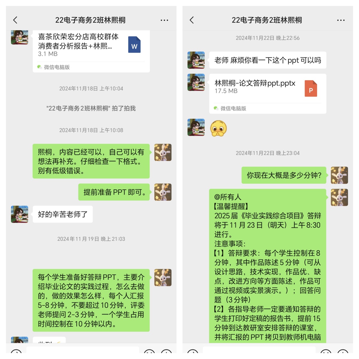 在学生作品完成期间,张秀婉老师采取了跟踪和反馈互动相结合的办法,根据学生在实践中遇到的问题,实时做出进一步解决和指导。对于学生提交的稿件,张老师采取逐层完善修订,确保所有重点内容和核心分析与毕业要求保持一致。每次修改后,都对学生做出阶段性进度反馈,确保其计划和资源使用的最优化。这一系列工作,确保了学生实践报告的高质量完成,也为学生提供了实际应用上的突破。同学们在完成的过程中,整体表现出了极高的积极性。修改速度快,对于毕业实践项目完成质量很高。